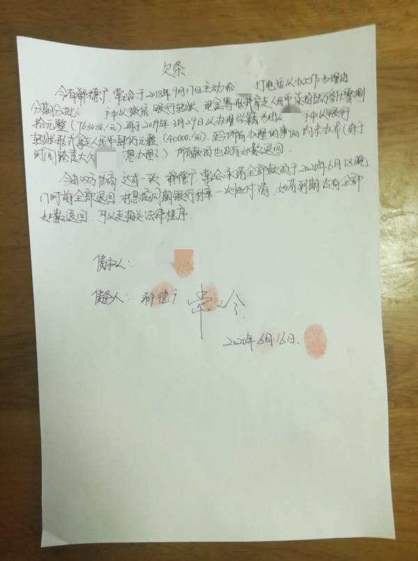 郗德廣、常嶺二人在2020年6月寫給張雪(化名)的欠條,明確寫明了他們以“辦工作”“辦學(xué)籍”收受了張雪80余萬,并約定了退還款項時間。受訪者供圖