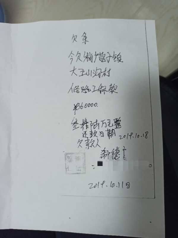 2019年10月,郗德廣寫給村路施工方的工程款欠款條,僅大王山溝村項目就拖欠36萬元。受訪者供圖