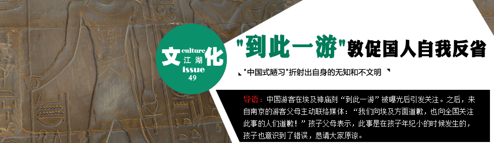 “在埃及最難過的一刻,無地自容。”網(wǎng)友“空游無依”的一條微博迅速引發(fā)熱議,他在埃及盧克索神廟的浮雕上看到有人用中文刻上“丁錦昊到此一游”,為國(guó)人輕易毀壞千年文物的行為感到震驚和羞愧。許多網(wǎng)友對(duì)此均表示氣憤,大呼“丁錦昊,你要火了”。 |