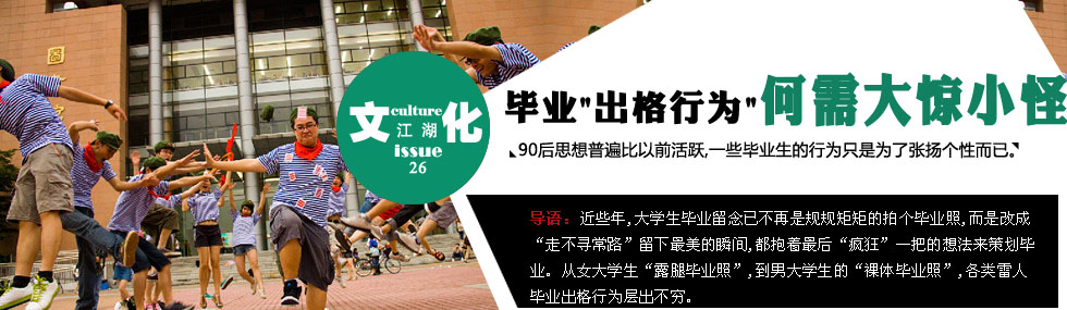 作為處于青春期的大學(xué)畢業(yè)生,在日常生活中追求新奇、創(chuàng)意、個(gè)性,喜歡另類、刺激、搞怪,尤其是在人生重要轉(zhuǎn)折點(diǎn)的畢業(yè)之際,把日子過得熱鬧些,但愿當(dāng)下的絕大多數(shù)人,皆能抱理解、寬容的心態(tài)。 |