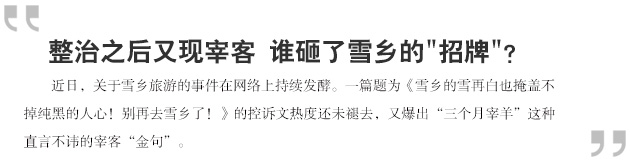 國家旅游局也發(fā)出通知,要求各地旅游主管部門進(jìn)一步重視旅游市場監(jiān)管工作,舉一反三,加大旅游市場整治力度,尤其要加強(qiáng)對冰雪旅游、森林旅游等旅游新業(yè)態(tài)的監(jiān)管,督促景區(qū)主管部門加強(qiáng)日常管理,嚴(yán)厲打擊“不合理低價(jià)游”、強(qiáng)迫消費(fèi)和欺客宰客等各類侵害游客合法權(quán)益的違法行為,切實(shí)履行起行業(yè)監(jiān)管職責(zé)。