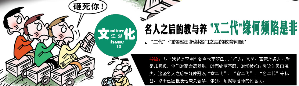 如果犯事的這些個公子哥們,不是錢權集中營里的“名門之后”,那么,這一樁樁一件件也不過是不太起眼的尋釁滋事。但是,公子們的身上偏偏都貼著華麗麗的“二代”標簽。于是,這些名爹名媽們也免不了被推上風口浪尖。畢竟,子不教,父之過。