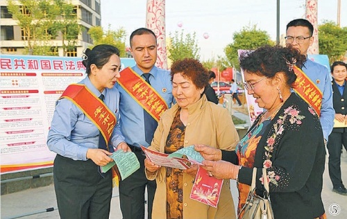 圖⑤:5月10日,新疆維吾爾自治區(qū)庫車市檢察院檢察官在街邊向市民宣講民法典。記者何海燕 迪力熱巴·艾合買提攝