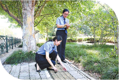 今年6月,接到某路段盲道緊靠大樹且兩側狹窄,影響盲人安全出行的線索后,江蘇省江陰市檢察院公益訴訟部門檢察官第一時間來到現場取證。 徐剛攝
