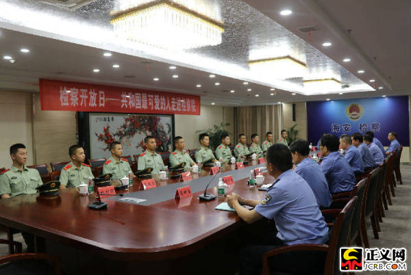 7月30日,江蘇省海安市檢察院舉行“檢察開(kāi)放日——共和國(guó)最可愛(ài)的人走進(jìn)檢察院”活動(dòng),邀請(qǐng)武警海安中隊(duì)官兵走進(jìn)該院,參觀體驗(yàn)檢察工作。