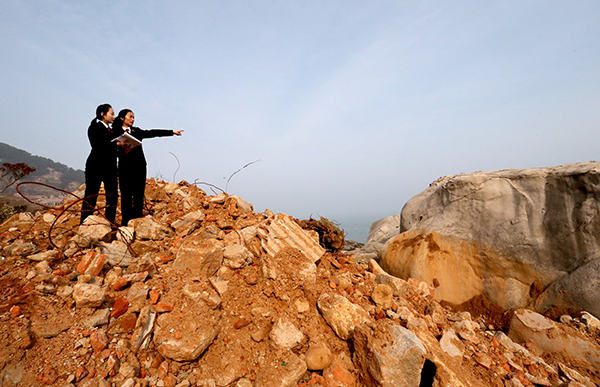 2019年2月22日,山東省青島市嶗山區(qū)檢察院接到群眾反映,泉心河入?诤╅L(zhǎng)期堆放廢棄建筑垃圾,破壞了前海海灘,嚴(yán)重影響海洋生態(tài)環(huán)境和嶗山自然保護(hù)區(qū)環(huán)境。該院負(fù)責(zé)公益訴訟工作的檢察官到現(xiàn)場(chǎng)查看情況、取證。黃瑩 攝