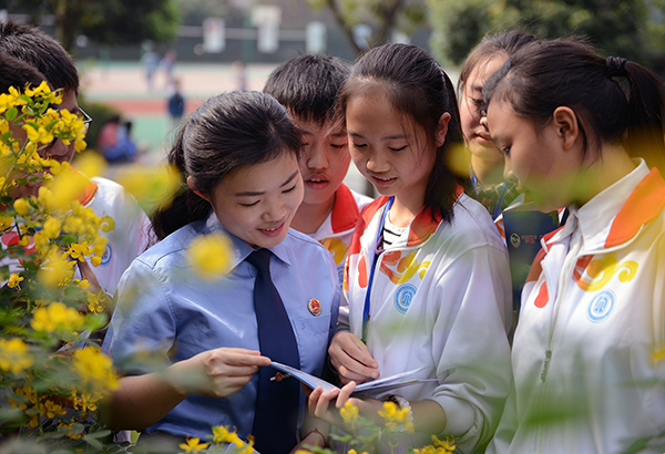 2020年10月15日,重慶市江津區(qū)檢察院青少年維權(quán)崗的“莎姐”檢察官們來(lái)到區(qū)田家炳中學(xué),開(kāi)展“普法開(kāi)學(xué)季·‘莎姐’百校行”活動(dòng)。活動(dòng)中,檢察官們走進(jìn)學(xué)生中,與學(xué)生開(kāi)展交流互動(dòng),讓同學(xué)們?cè)谳p松愉快的氛圍中學(xué)到法律知識(shí)。江泳 攝