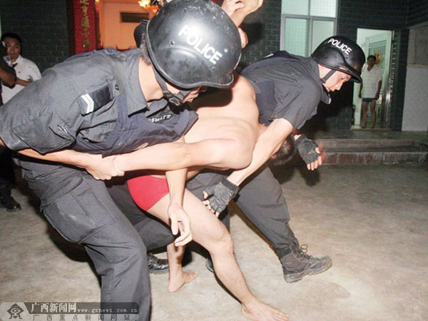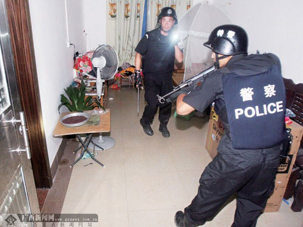 7月8日凌晨,南寧市公安局為切底打擊黑社會(huì)團(tuán)伙,組織300多民警全副武裝迅速趕到轄區(qū)橫縣橫州鎮(zhèn)境內(nèi),并分成若干組對犯罪嫌疑人進(jìn)行實(shí)施布控抓捕。經(jīng)過四個(gè)多小時(shí)的抓捕,成功地將橫州鎮(zhèn)閉氏兄弟為首的最大一伙涉黑團(tuán)伙一網(wǎng)打盡,共抓捕犯罪嫌疑人15人。