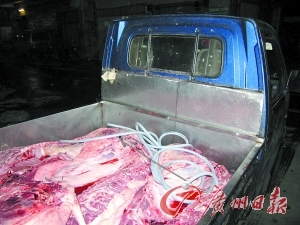 本報上周關(guān)于注水肉未經(jīng)檢疫就流入市場的報道掀起波瀾。本以為,給母豬肉注水的情況會暫時消失一段時間,不料,就在6月16日凌晨,在知情人的帶領(lǐng)下,記者在莞城金沙市場外,親眼目睹數(shù)十名屠宰戶當(dāng)街給母豬肉注水。