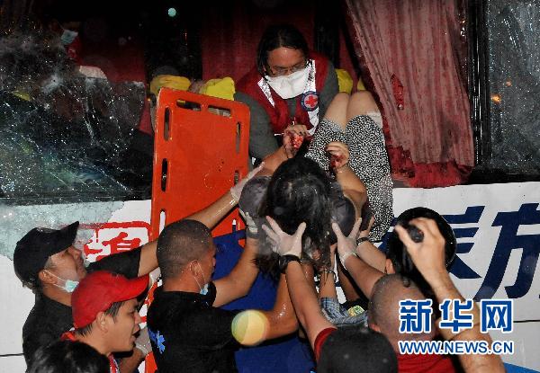8月23日,在菲律賓首都馬尼拉,警察從被劫持的大巴中救出一名人質(zhì)。香港康泰旅行社一個(gè)旅行團(tuán)23日上午在馬尼拉遭到劫持,目前已確認(rèn)有8名旅行團(tuán)成員死亡。 新華社發(fā)(魯埃勒·烏馬利攝)