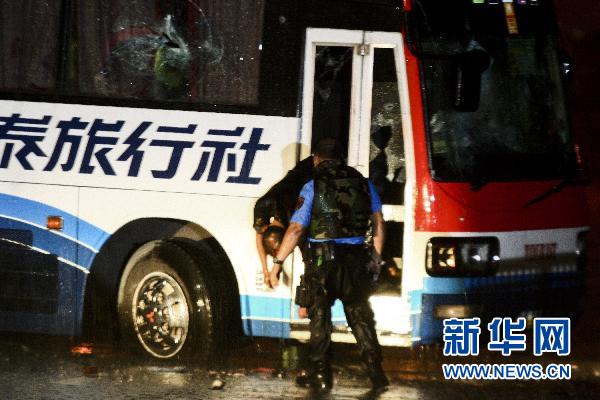 8月23日,在菲律賓首都馬尼拉,劫持中國香港旅游團(tuán)的菲律賓劫匪(左)被擊斃后尸體掛在車門上。據(jù)菲律賓當(dāng)?shù)仉娨暸_(tái)23日?qǐng)?bào)道,經(jīng)過11個(gè)小時(shí)對(duì)峙,劫持一中國香港旅游團(tuán)大客車的劫匪被菲警方擊斃。此前,劫匪槍殺了部分未釋放的人質(zhì)。