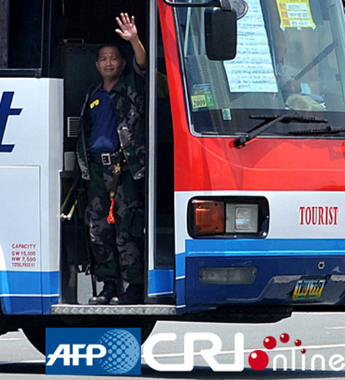劫持游客的劫匪站在巴士車門處,他身著此前任警察時(shí)的制服,手持M-16自動(dòng)步槍,向遠(yuǎn)處的人群揮手。