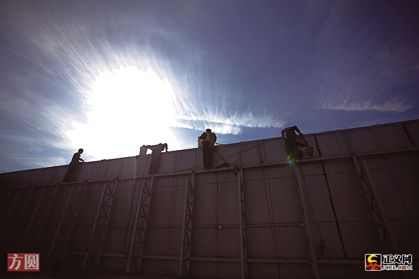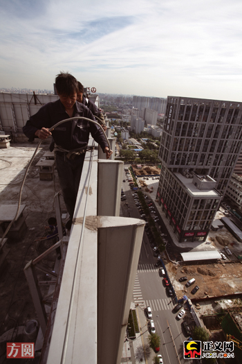 張永奎和他的伙伴們攀上萬達頂層的外墻,準備下樓工作。