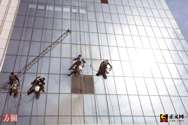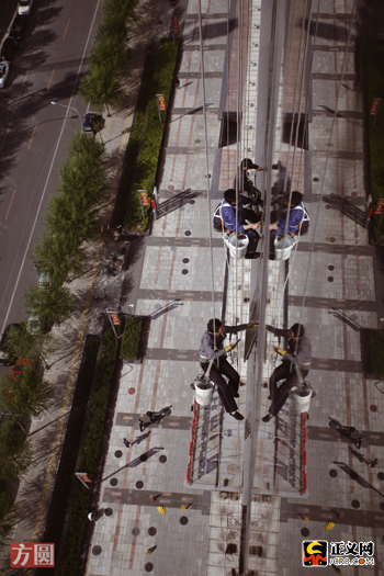 張永奎們第二次躍下大樓,開始擦外墻玻璃,干完這次活,他們就可以吃中午飯了。