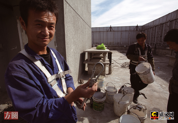 “做這個工作的都是老鄉(xiāng)帶老鄉(xiāng),最開始有一個師傅帶著干!绷钠鹱约旱墓ぷ,張永奎很高興,“剛開始干活兒有點怕,時間長了就沒事了,干活的時候別看樓底下就成!碧崞鸷Σ缓ε逻@個問題,張永奎說自己早就習慣了,還告訴記者萬達并不是他工作過的最高的大樓。北京城最高的建筑物——國貿三期,他曾經(jīng)給這座300多米高的大廈擦過外墻玻璃。說這些的時候,他的話中透著一股自豪。