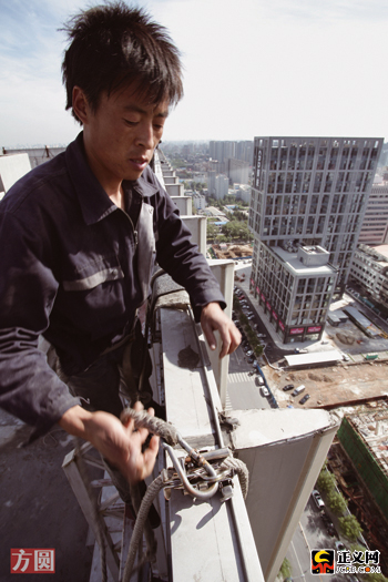 張永奎利索地把一根繩子的一頭系在22層大樓樓頂橫著的一根鐵杠上,用手使勁兒扥了扥,然后習慣性地往樓下望了一眼,看看是否有行人路過之后,他把繩子的另一頭拋到了樓外。待一切準備工作做好之后,他把保險栓掛在繩子上,然后整個人背朝外、順著早已系好的另一根繩子滑溜下去,穩(wěn)穩(wěn)當當?shù)鼗M底下掛著水桶的1米見方的木板上,再次扥扥繩子之后,他慢慢松開木板上的繩結,木板帶著他從22樓樓頂順著玻璃外墻向下垂直降落——這不是在進行蜘蛛俠的表演,這只是張永奎工作時的一個普通場景,他是那些攀爬在城市高樓外墻上進行清潔工作的工人之一,他們被稱作“蜘蛛人”。
