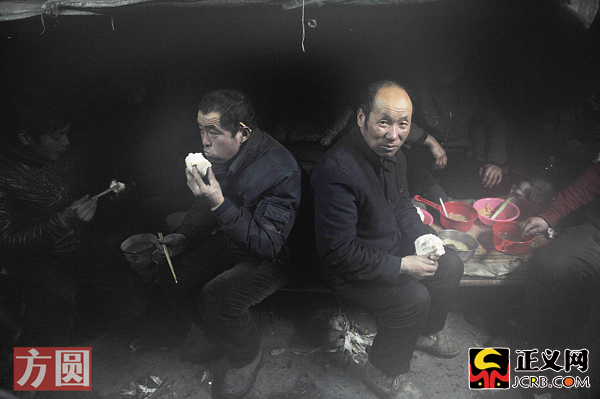吃過(guò)飯的農(nóng)民工紛紛脫下腳上潮濕的鞋子,放在工棚的火墻上面烘烤。中午短暫的一個(gè)小時(shí)休息時(shí)間對(duì)于他們來(lái)說(shuō)極為寶貴。