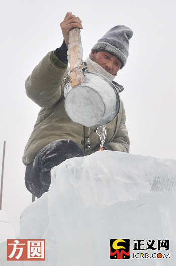 農(nóng)民工往冰塊上澆水,使它們凍結(jié)在一起,戲稱(chēng)“水焊”。