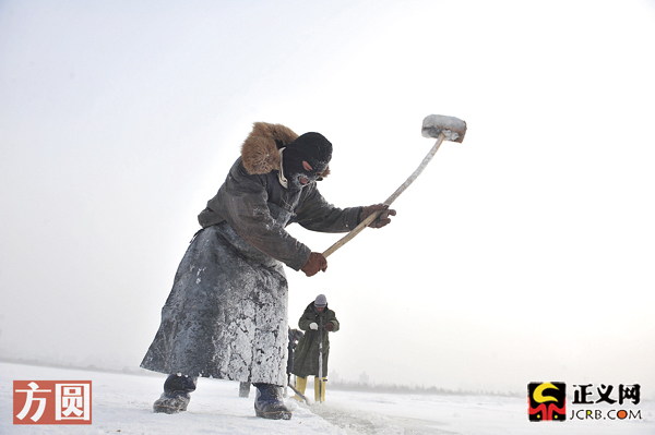 儲(chǔ)雙成說(shuō):“我們凌晨4點(diǎn)多就要來(lái)這兒,晚上6點(diǎn)收工。我們?cè)敢舛鄤趧?dòng),因?yàn)椴杀蕉,就可以掙越多的錢(qián)補(bǔ)貼家用。采冰也是技術(shù)活,不能有裂紋,厚度要在40公分以上。一立方米冰給4元錢(qián),一天可以掙到100多元錢(qián)。這里不欠工錢(qián),每天都能拿到現(xiàn)錢(qián)。”