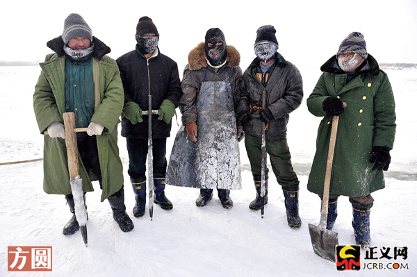 來(lái)自哈爾濱近郊幸福鄉(xiāng)的采冰人儲(chǔ)雙成,穿著厚厚的棉衣,頭部和面部都包裹得很?chē)?yán)實(shí),眼睛只露出一道縫隙,臉上掛滿(mǎn)了厚厚的冰霜。