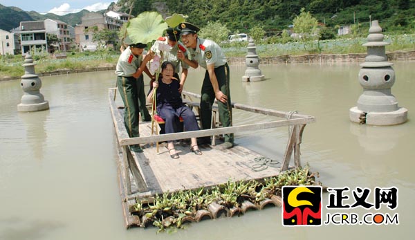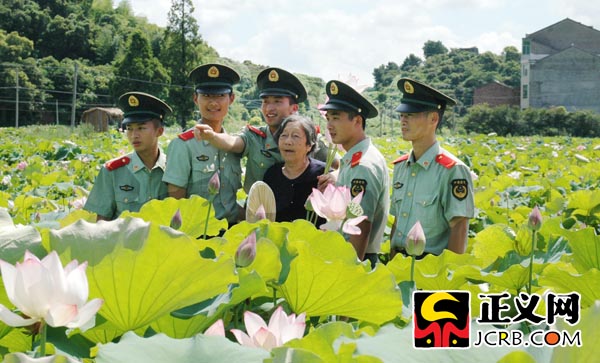 武警浙江省總隊(duì)溫嶺市中隊(duì)的官兵們,幫助了93歲的孤寡老人林文錦在溫嶺家門(mén)口, 實(shí)現(xiàn)欣賞荷花, 游"西湖三潭印月" 的愿望。