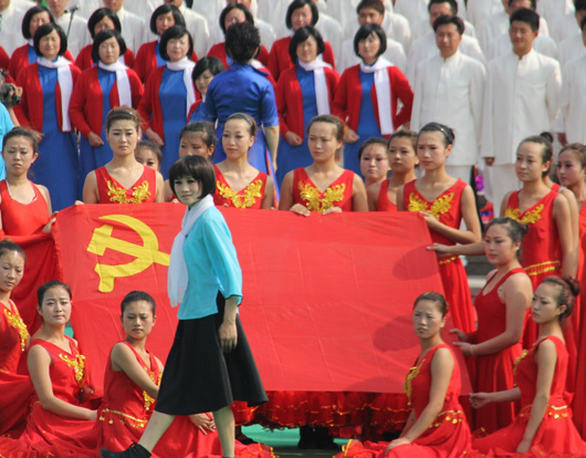 來自寧夏各機關(guān)單位、校園、社區(qū)共2000多名群眾演員,從少年學(xué)子到年過七旬的老人,無不激情高昂詮釋著紅歌的精神與內(nèi)涵,展示了寧夏人民建設(shè)和諧寧夏、富裕寧夏的精神風(fēng)貌;顒幼詈,全體演職人員與觀眾激情滿懷合唱《沒有共產(chǎn)黨就沒有新中國》,傳達塞上兒女堅決跟黨走的豪邁信心。