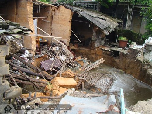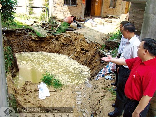 6月26日中午,博白縣沙河鎮(zhèn)沙河村3處地方發(fā)生地陷,4間民房陷入水坑中,附近共有11棟229間民房的墻壁和地面出現(xiàn)不同程度裂縫,所幸沒有造成人員傷亡。事發(fā)后,當(dāng)?shù)攸h委、政府立即啟動應(yīng)急預(yù)案,轉(zhuǎn)移安置35戶受災(zāi)村民。據(jù)了解,事故初步鑒定為地質(zhì)災(zāi)害,可能是由于連續(xù)多天下雨,地下河水上漲造成地陷。