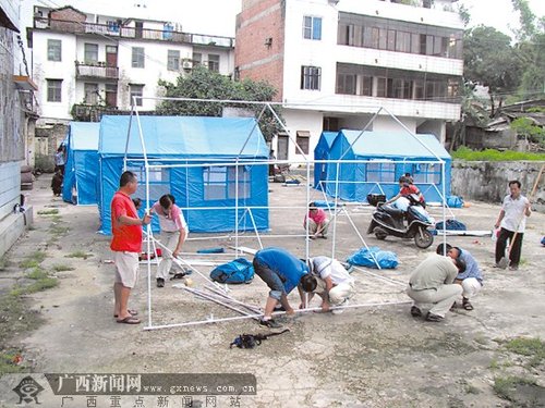 相關(guān)人員正在搭建帳篷安置受災(zāi)村民。記者 趙敏攝