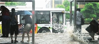 6月28日,長沙市八一橋路段,受暴雨天氣影響,路面積水很深,幾位市民在躲避公交車路過濺起的水花。 記者 王翀鷹 攝