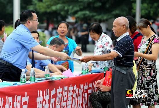 正義網(wǎng)九江6月24日電(通訊員 劉興鹿 賴青青)“我的棉花地征地款至今還沒(méi)有到位,這事你們檢察院管不?”“大媽,您先說(shuō)說(shuō)具體情況,該我們管的我們肯定管!”6月23日上午,江西湖口縣檢察院在該縣鄱陽(yáng)湖大市場(chǎng)正式啟動(dòng)全國(guó)檢察機(jī)關(guān)第十七個(gè)“舉報(bào)宣傳周”活動(dòng),該院領(lǐng)導(dǎo)以及經(jīng)抽調(diào)出來(lái)的全院20余名各科室骨干參加本次活動(dòng)。舉報(bào)宣傳活動(dòng)吸引了大量群眾駐足而觀,活動(dòng)開始不久,就有群眾上前咨詢。
