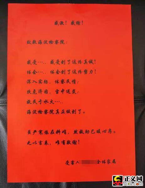 宣布會(huì)現(xiàn)場(chǎng),被害人子女接過(guò)20萬(wàn)救助金時(shí),激動(dòng)地對(duì)在場(chǎng)檢察官說(shuō):“我們沒(méi)有想到檢察官會(huì)主動(dòng)跟我們提司法救助的事,更沒(méi)想到你們能救助我們這么及時(shí)和有力。我母親受傷后,家人心理上受到很大煎熬,現(xiàn)在每個(gè)月的醫(yī)療費(fèi)都要十萬(wàn)元,我們也試著尋求其他救助,但是程序繁瑣、幫助有限。最終是在檢察院我們切實(shí)地感受到了你們是真心想幫助我們……”隨后他們拿出精心準(zhǔn)備的感謝信,一字一句讀出來(lái):“海淀檢察院深入實(shí)際、體察民情;扶危濟(jì)困、雪中送炭……”