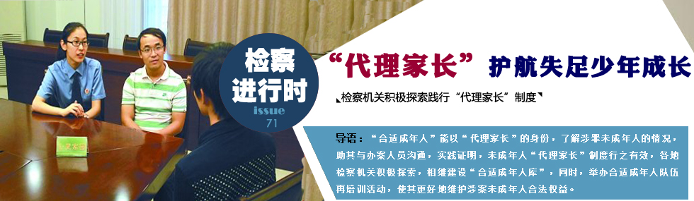 2013年初,四川省南充市嘉陵區(qū)檢察院開始積極探索“代理家長參與未成年人犯罪案件訴訟制度”,在和司法局、關(guān)工委的多次聯(lián)席會議討論和磋商中,三方最終達成共識,簽署了《關(guān)于“代理家長”參與刑事訴訟的相關(guān)規(guī)定》文件。 |
