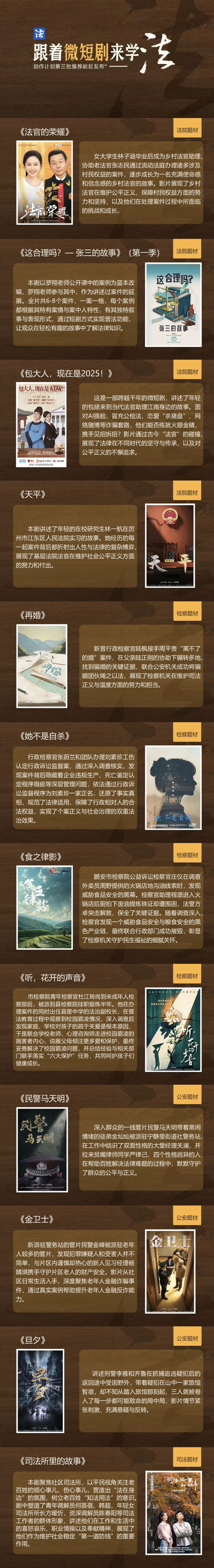 在28日的“法治視聽賦能中國法治建設(shè)”分論壇上,“跟著微短劇來學法”創(chuàng)作計劃第三批推薦劇目正式發(fā)布,來自公檢法司等部門的12部作品入選。由最高人民檢察院新聞辦公室指導的檢察題材網(wǎng)絡(luò)微短劇《再婚》《她不是自殺》《食之律影》《聽,花開的聲音》4部作品獲推薦。這些入選作品緊扣全民普法與法治宣傳主題,以生動鮮活的視聽語言展現(xiàn)法治實踐。