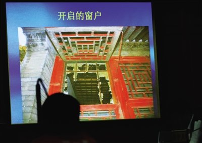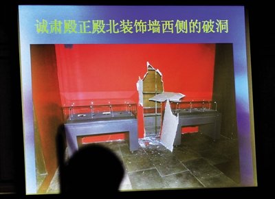 進入誠肅殿內(nèi)后,石柏魁摸索到一面墻。敲擊感覺不是石墻,于是手腳并用扒開一個破洞,從洞口鉆進事發(fā)現(xiàn)場的展廳。