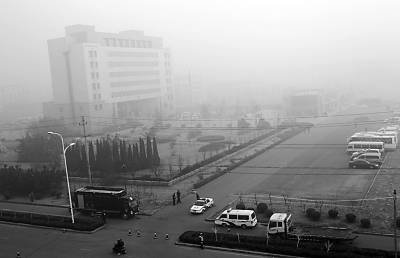 12月20日清晨,霧中的膠州法院周邊戒備森嚴。弋雍攝