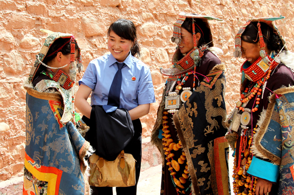 7月25日下午,西藏自治區(qū)阿里地區(qū)普蘭縣檢察院檢察官曲尼措姆與同事來到普蘭鎮(zhèn)科迦村,宣傳黨的富民政策和法律知識(shí)。圖為檢察官與剛剛參加完民俗服飾表演的藏族婦女交談。