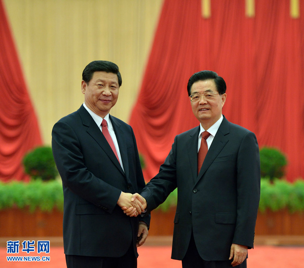 11月15日,國家主席胡錦濤,新當(dāng)選的中共中央總書記、中共中央軍委主席習(xí)近平等領(lǐng)導(dǎo)同志在北京人民大會堂親切會見出席黨的十八大代表、特邀代表和列席人員并發(fā)表重要講話。這是胡錦濤和習(xí)近平親切握手。新華社發(fā)