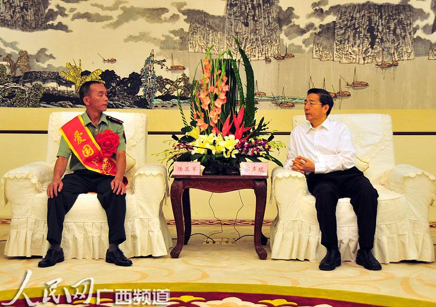 大會上,自治區(qū)黨委書記、自治區(qū)人大常委會主任郭聲琨,廣州軍區(qū)副司令員王治民中將作了重要講話,充分肯定了陸蘭軍堅守邊疆的愛國奉獻精神,號召全區(qū)黨員干部群眾以陸蘭軍為榜樣,堅定信念愛國奉獻、立足本職創(chuàng)先爭優(yōu),為加快實現(xiàn)富民強桂新跨越而努力奮斗。自治區(qū)主席馬飚同志宣讀《廣西壯族自治區(qū)人民政府 廣西軍區(qū)關(guān)于授予陸蘭軍同志“愛國戍邊楷!狈Q號的命令》。之后馬飚與廣西軍區(qū)司令員龍義和給陸蘭軍頒發(fā)了證書和獎牌。