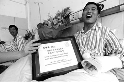 昨天,在解放軍411醫(yī)院內(nèi)科大樓11樓的手外科病房26號病床上,周傳金領到了上海市見義勇為評審委員會為他頒發(fā)的“上海市見義勇為先進分子”證書。昨天傍晚,周母從安徽趕到上?赐麅鹤印P≈芩诘墓疽财钙錇榻K身員工。