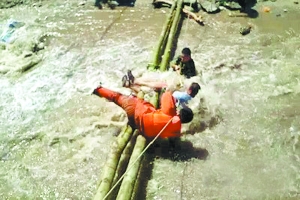 昨天上午8時,救援小隊組織被困游客下山。在斷橋處,消防官兵在附近找來兩棵被大雨沖倒的大樹,用鐵絲將樹綁在一起,做成一個“雙木橋”,上方牽引繩索,組織游客過橋。老人、婦女、孩子都是消防戰(zhàn)士護送或是抱過去的。