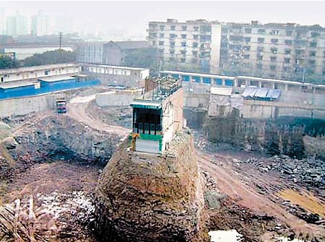 2007年3月初,網(wǎng)上開始流傳一個帖子,題目是《史上最牛的釘子戶》,內(nèi)容是一張圖片:一個被挖成10米深大坑的樓盤地基正中央,孤零零地立著一棟二層小樓,猶如大海中的一葉孤舟。(圖片來自網(wǎng)絡(luò))