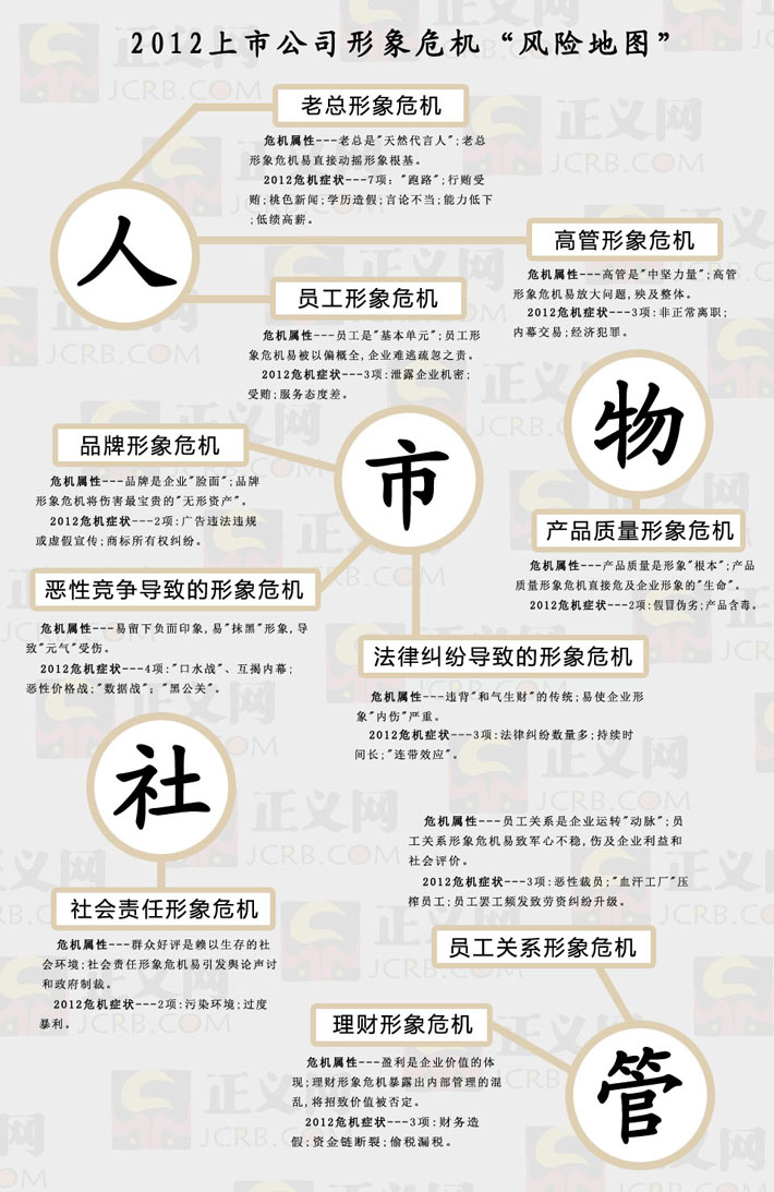 上市公司形象危機(jī)是指上市公司由于各種因素引發(fā)的負(fù)面形象和社會(huì)惡劣影響。中國人民大學(xué)危機(jī)管理研究中心唐鈞主任,在社科院藍(lán)皮書《形象危機(jī)應(yīng)對(duì)研究報(bào)告2012(企業(yè)篇)》(社會(huì)科學(xué)文獻(xiàn)出版社)的基礎(chǔ)上,通過對(duì)2012年度上市公司形象危機(jī)典型案例庫的研究形成該報(bào)告。