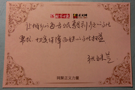 張妹芝委員寄語(yǔ)檢察日?qǐng)?bào)社正義網(wǎng):切實(shí)保障百姓的文化權(quán)益