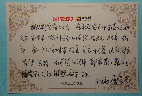全國人大代表,臨汾市第四人民醫(yī)院院長賈愛芹:每個人都要有正義感,在社會發(fā)展中有責(zé)任和義務(wù)。宣傳和執(zhí)行國家的法律、法規(guī)、規(guī)章。每一個人面對有損國家利益、違反國家法律、法規(guī)和道德的事件,都有責(zé)任站出來,用自己的行動維護公平正義。