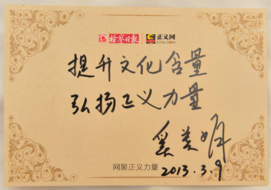 奚美娟代表寄語(yǔ)檢察日?qǐng)?bào)社正義網(wǎng):提升文化含量 弘揚(yáng)正義力量