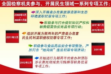 依法嚴查危害民生的各類犯罪,及時回應群眾關切。2008年以來,全國檢察機關積極參與和深入開展了一系列專項工作: