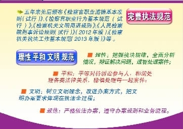 經(jīng)過一年多的努力,2010年12月,高檢院發(fā)布《檢察機關(guān)執(zhí)法工作基本規(guī)范(2010年版)》,對檢察機關(guān)執(zhí)法中涉及的每一個崗位、環(huán)節(jié)、要求都作出明確的規(guī)定,涵蓋了執(zhí)法辦案的全部流程,實現(xiàn)了執(zhí)法標準統(tǒng)一化、執(zhí)法環(huán)節(jié)具體化、執(zhí)法要求明確化,有效解決了執(zhí)法辦案中存在的薄弱環(huán)節(jié)和突出問題,提高了辦案質(zhì)量。為貫徹修改后刑訴法、民訴法,2013年2月17日,《檢察機關(guān)執(zhí)法工作基本規(guī)范(2013年版)》印發(fā),進一步強化了對檢察機關(guān)執(zhí)法辦案的監(jiān)督,增加了“案件管理”等內(nèi)容。