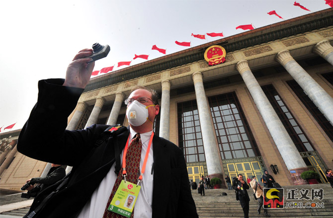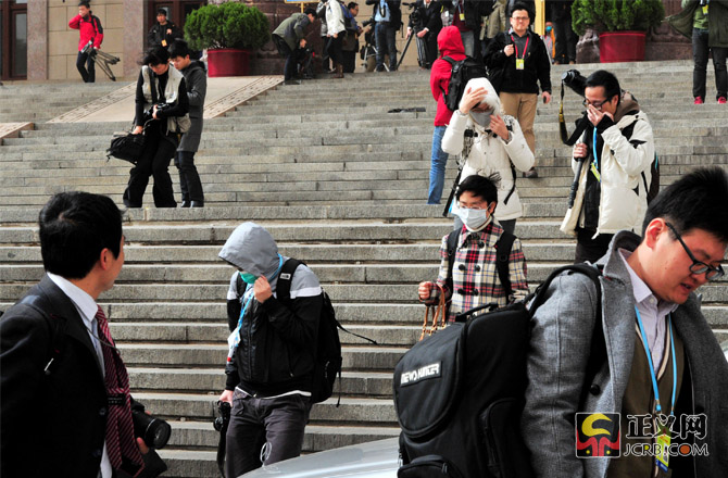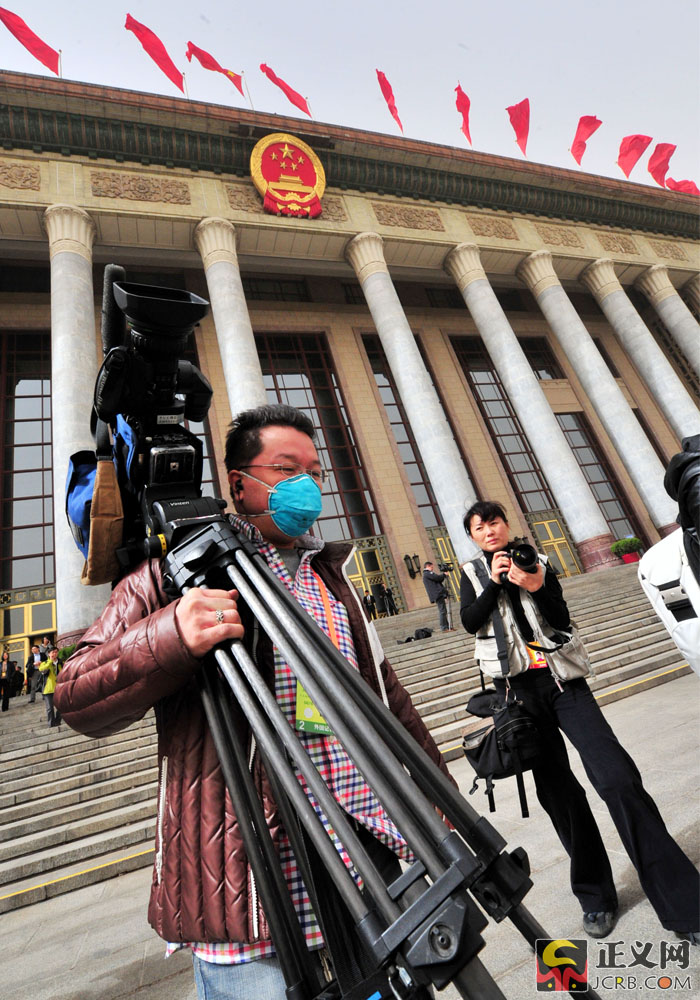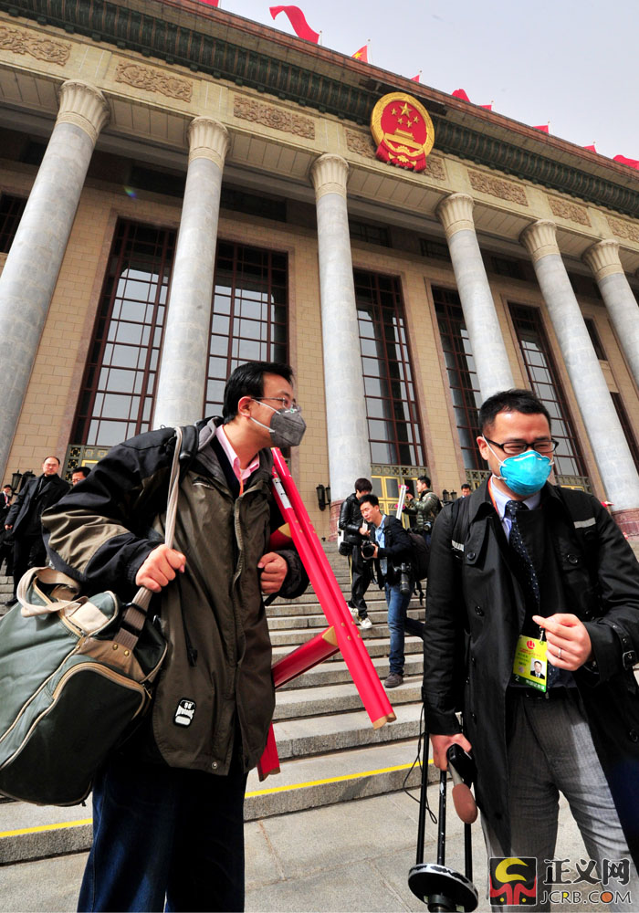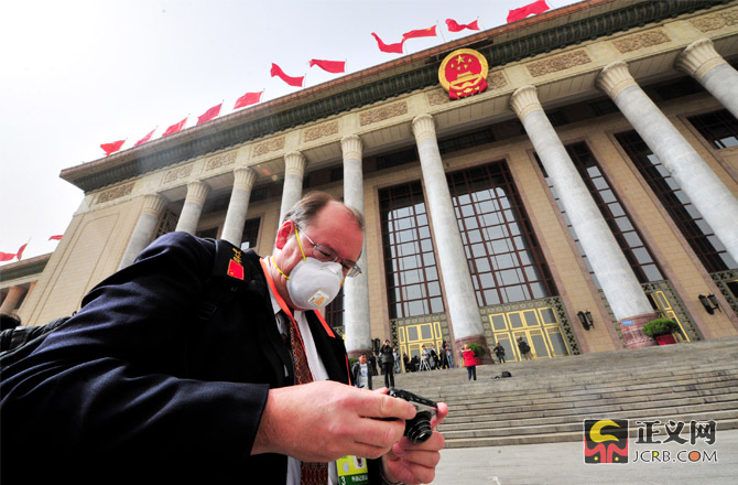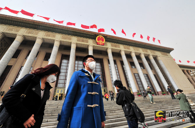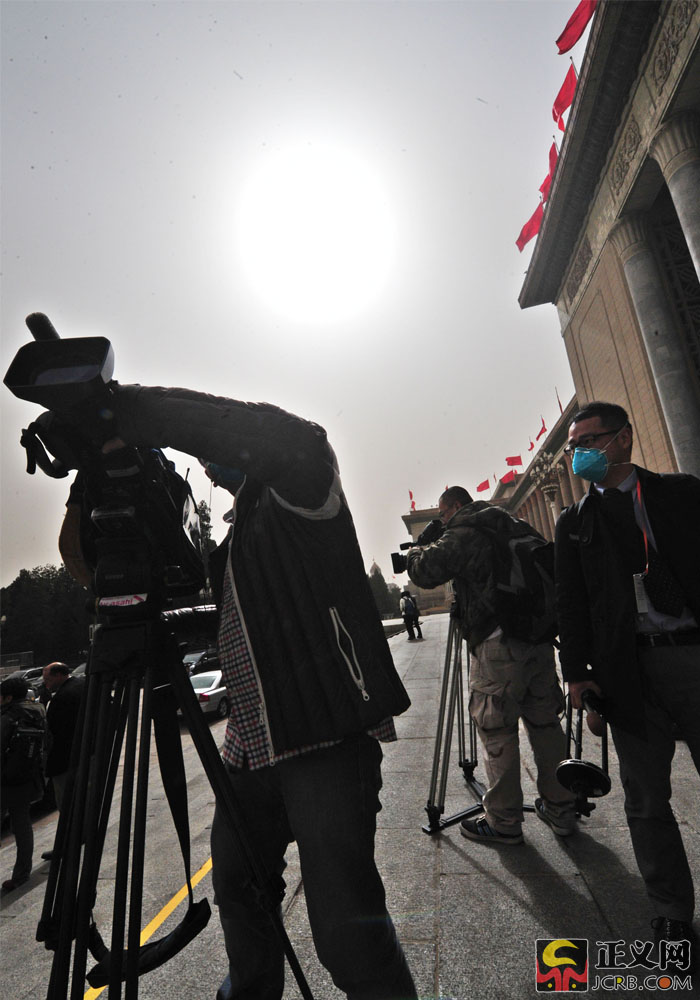 3月9日,北京遭遇大風(fēng)沙塵天氣,陣風(fēng)達(dá)7、8級(jí),京城呈現(xiàn)出“霧霾未去、沙塵再起”天氣。截止記者發(fā)稿時(shí),北京城區(qū)空氣質(zhì)量處于污染水平,部分地區(qū)達(dá)到重度污染(5級(jí))或嚴(yán)重污染(6級(jí))。圖為人民大會(huì)堂前,兩會(huì)記者們依然帶著口罩堅(jiān)守在采訪一線。正義網(wǎng)記者程丁 攝