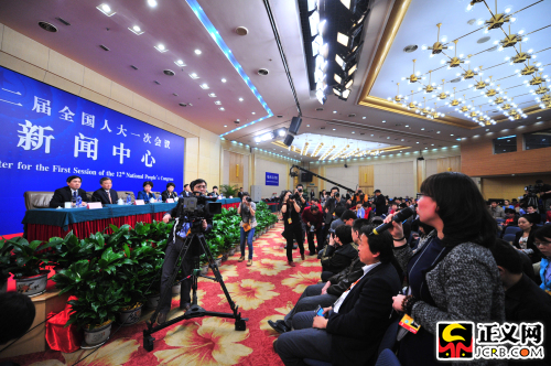 3月9日,在梅地亞中心多功能廳舉行記者會。全國人大常委會副秘書長何曄暉,全國人大內(nèi)務(wù)司法委員會副主任委員陳斯喜,全國人大常委會法制工作委員會副主任信春鷹、郎勝,全國人大常委會預(yù)算工作委員會副主任姚勝將就“人大工作”相關(guān)問題回答中外記者提問。正義網(wǎng)記者程丁 攝