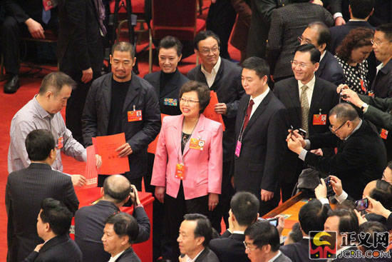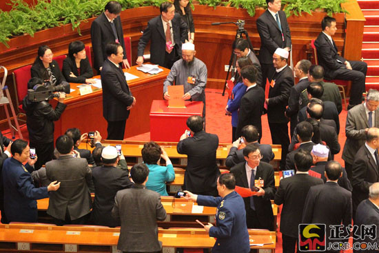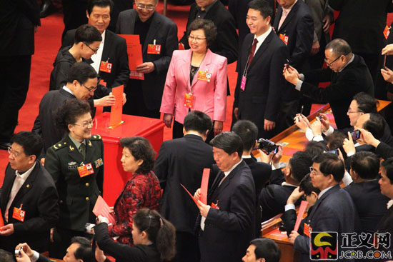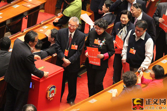 3月11日下午,全國政協(xié)十二屆一次會議在北京人民大會堂舉行第四次全體會議。大會采用無記名投票方式,選舉產(chǎn)生了政協(xié)第十二屆全國委員會主席、副主席、秘書長和常務(wù)委員。新當選的全國政協(xié)主席、副主席平均年齡為63.7歲,副主席中,中共黨員11名,非中共人士12名,少數(shù)民族人士4名,女性2名。新當選的常務(wù)委員平均年齡為59.4歲,其中非中共人士195名,占65.2%;少數(shù)民族人士38名;女性36名。選舉結(jié)束后,全場委員以熱烈掌聲祝賀新一屆政協(xié)全國委員會常務(wù)委員會的誕生。圖為委員們來到投票箱前投票。正義網(wǎng)記者 徐伯黎/攝